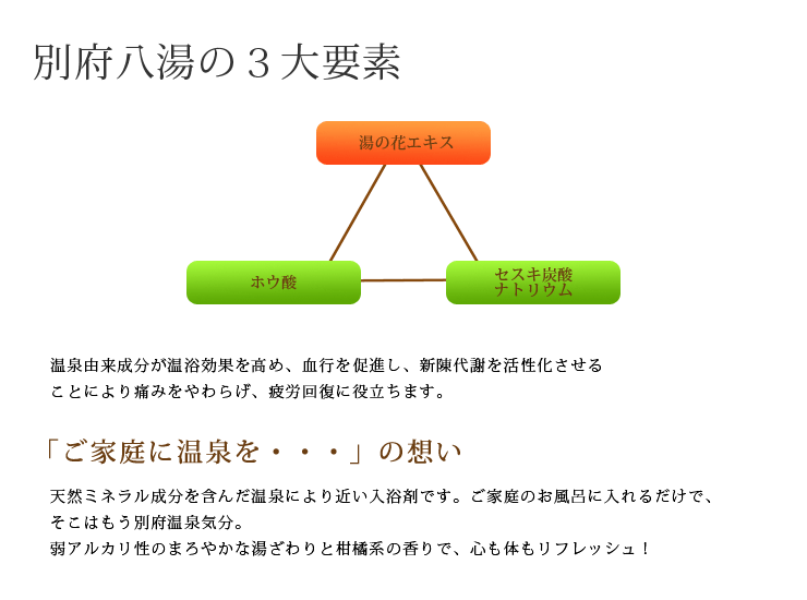 効果効能 冷え症・荒れ性・神経痛・リウマチ・しもやけ・ひび・あかぎれ・うちみ・くじき・肩のこり・腰痛・痔・あせも・しっしん・疲労回復 浴槽にもやさしい。