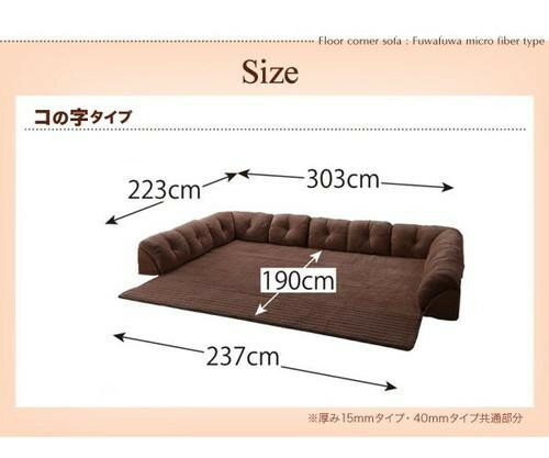 こたつに合わせるフロアコーナーソファふわふわマイクロファイバータイプ防ダニ・抗菌防臭機能付き【サイズ】■L字小:幅175 奥行175 高さ31cm、マットサイズ:142 142cm大:幅223 奥行223 高さ31cm、マットサイズ:190 190cmワイド:幅270 奥行223 高さ31cm、マットサイズ:237 190cm■コの字小:幅208 奥行175 高さ31cm、マットサイズ:142 142cm大:幅256 奥行223 高さ31cm、マットサイズ:190 190cmワイド:幅303 奥行223 高さ31cm、マットサイズ:237 190cm※40mm厚タイプのみパッド付き【梱包サイズ】■L字15mm小:1梱包(約)104 66 78 cm大:1梱包(約)104 66 78 cmワイド:1梱包(約)96 53 97 cm■L字40mm小:2梱包(約)96 53 97/100 40 48 cm大:2梱包(約)96 97 53cm/100 48 40cm ワイド:2梱包(約)96 97 53cm/100 48 40cm■コの字15mm小:2梱包(約)104 66 78cm/100 40 48 cm大:2梱包(約)104 66 78/100 40 48 cmワイド:2梱包(約)104 66 78/100 40 48 cm■コの字40mm小:2梱包(約)104 66 78/96 53 97 cm大:2梱包(約)104 66 78/96 53 97 cmワイド:2梱包(約)104 66 78/96 53 97 cm【素材】■クッション側地:ポリエステル100%中材:ウレタンフォーム、粉砕チップ■厚み15mmマット側地:ポリエステル100%中材:ウレタンフォーム、ポリエステルわた(防ダニ・抗菌防臭わた使用)■厚み40mmマット側地:ポリエステル100%中材:ウレタンフォーム■厚み40mmマットに付属のパッド側地:ポリエステル100%中材:ポリエステルわた(防ダニ・抗菌防臭わた使用)【生産国】日本(側地:中国)【注意事項】※サイズは概算です。